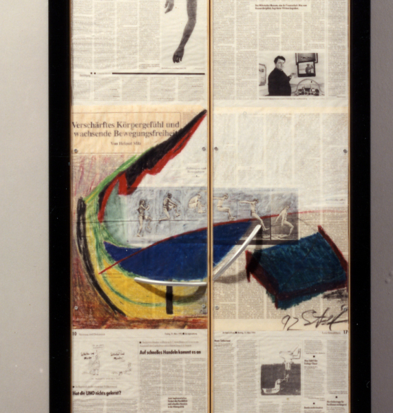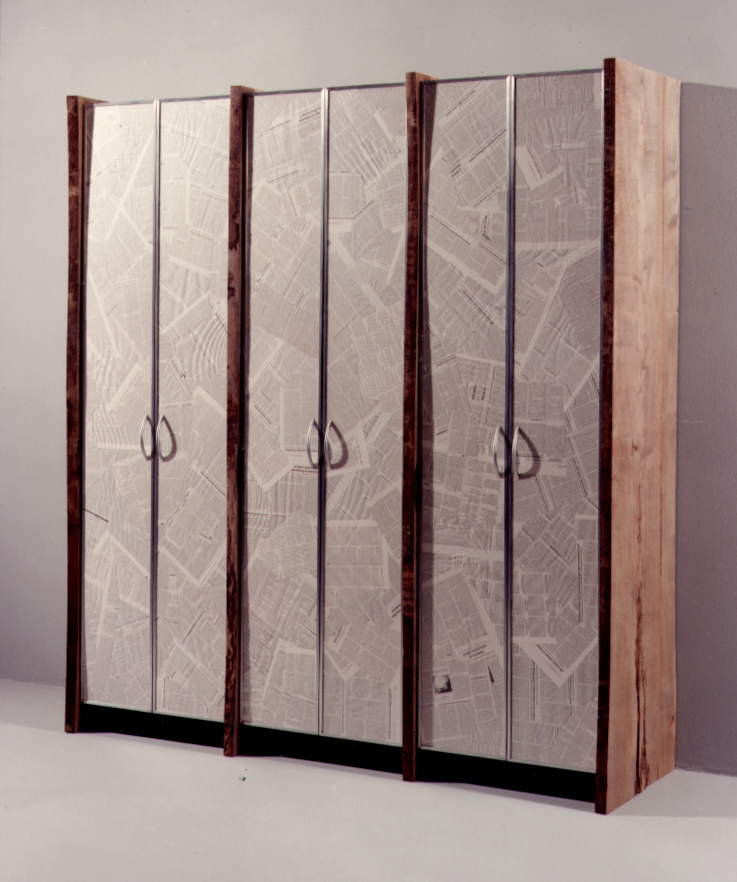 Ob Fototapete oder Kinderbilder, alles ist zur Gestaltung möglich und veränderbar mit den Türen als Wechselrahmen. Hier korreliert Zeitungspapier mit dem Werkstoff Holz und lässt mit der Buchstabenwüste die Türfläche kühl betont.