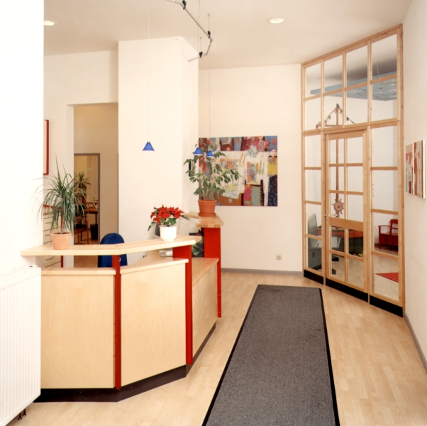 Der Einschnitt in der Theke erlaubt dem Kind einen Blick auf den Gesprächspartner der Eltern. Das helle Birkenfurnier und die rot gebeizten Multiplex Hölzer lassen dem Raum in einer fröhlichen Helligkeit. Dies Alles erleichtert den Beginn eines Kinderarzt Besuchs.